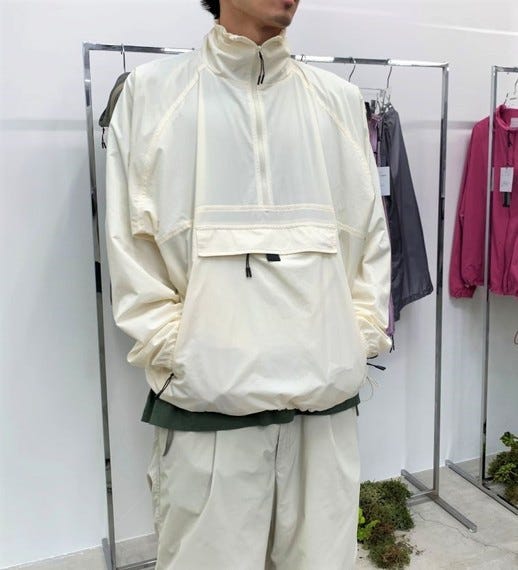 全22型。23年秋冬と同様、アウトドアブランドである「マーモット」のアーカイブをベースに、シルエットや色をタウンユース向けにアップデートした商品を企画した。アノラック(税抜き3万円)は、80年代のカタログにあった「リンクス」というモデルをベースにした。ラグランスリーブと襟元のハーフジップが特徴で、大ぶりなカンガルーポケットの両サイドにはハンドウォーマーポケットが付いている。同素材のカーゴパンツ(3万円)は膝下部分がジッパーで着脱でき、ショートパンツにもなる。