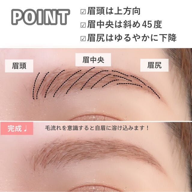 眉頭を上方向に、眉中央は斜め45度、眉尻は下降するように描いていくと自眉に馴染んで美しい仕上がりになりますよ♡