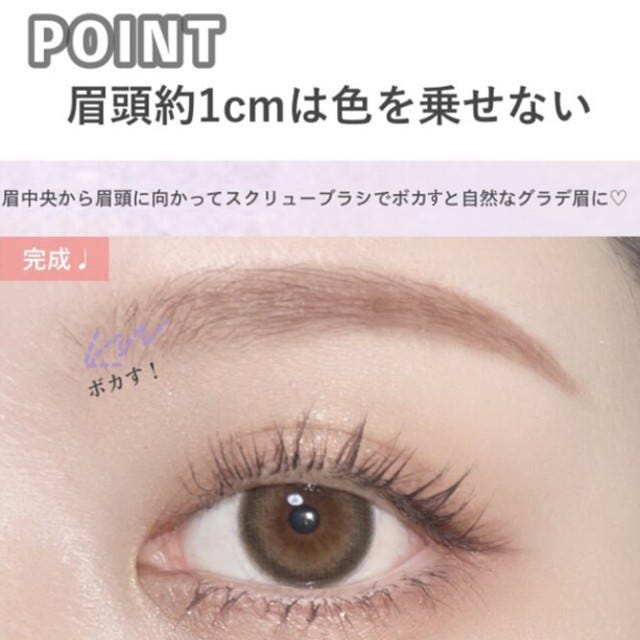 眉頭が濃いとキツい印象に見えてしまうので、眉頭約1cmは色を乗せずに、眉中央から眉頭に向かってスクリューブラシでボカす程度にしましょう♪