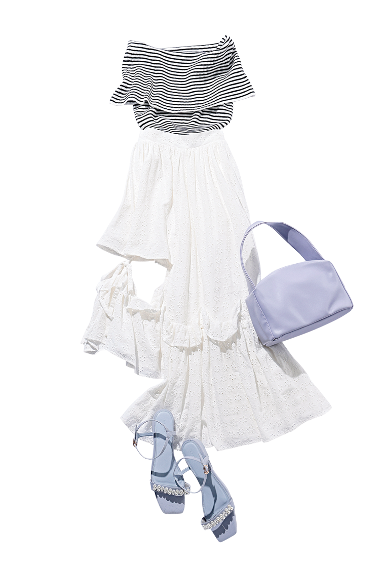 アシンメトリースカートは着回し。ボーダートップス 9,900円/SNIDEL パープルバッグ 5,800円/Olu. ブルーサンダル 7,920円/RANDA
