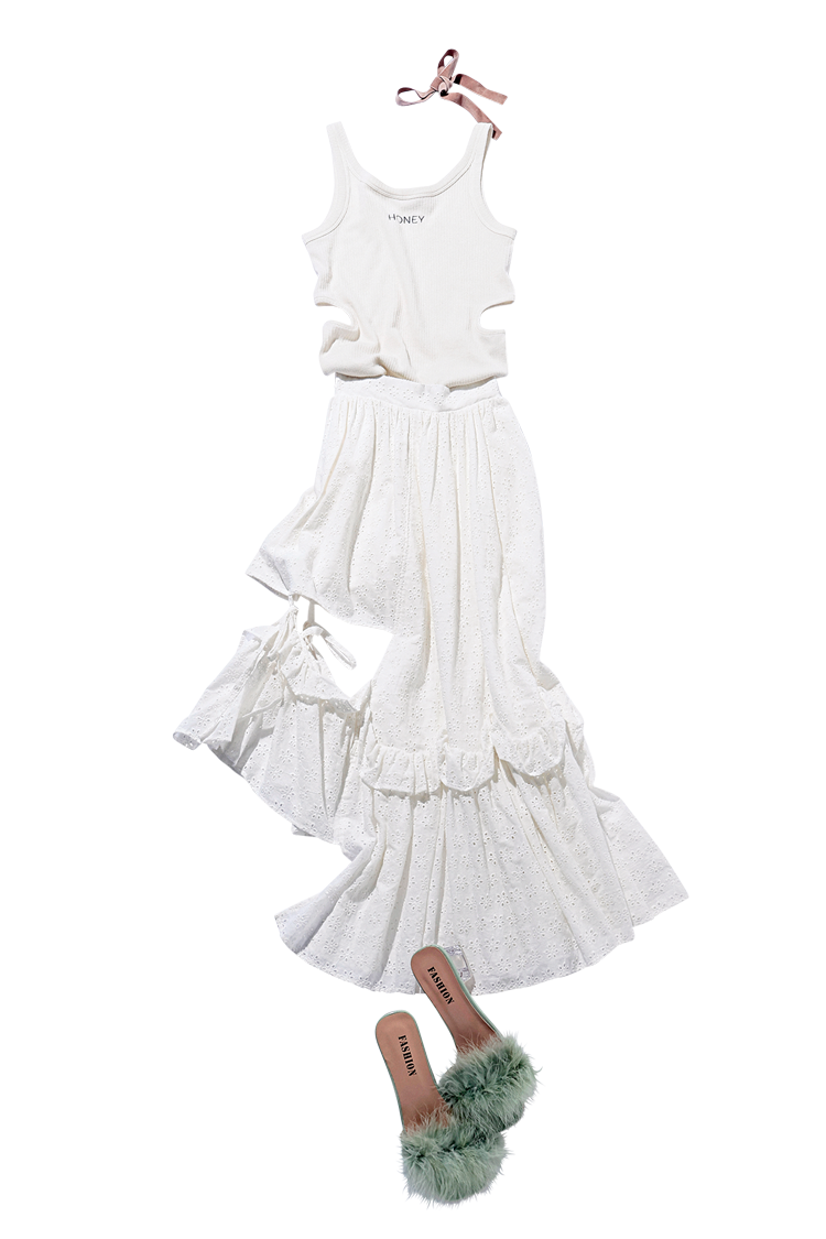 アシンメトリースカートは着回し。リブタンクトップ 12,100円/HONEY MI HONEY グリーンファーサンダル 4,700円/MORE self LOVE ヘアリボン/スタイリスト私物 Coordinate5 ふわっとフリルの甘めコーデ