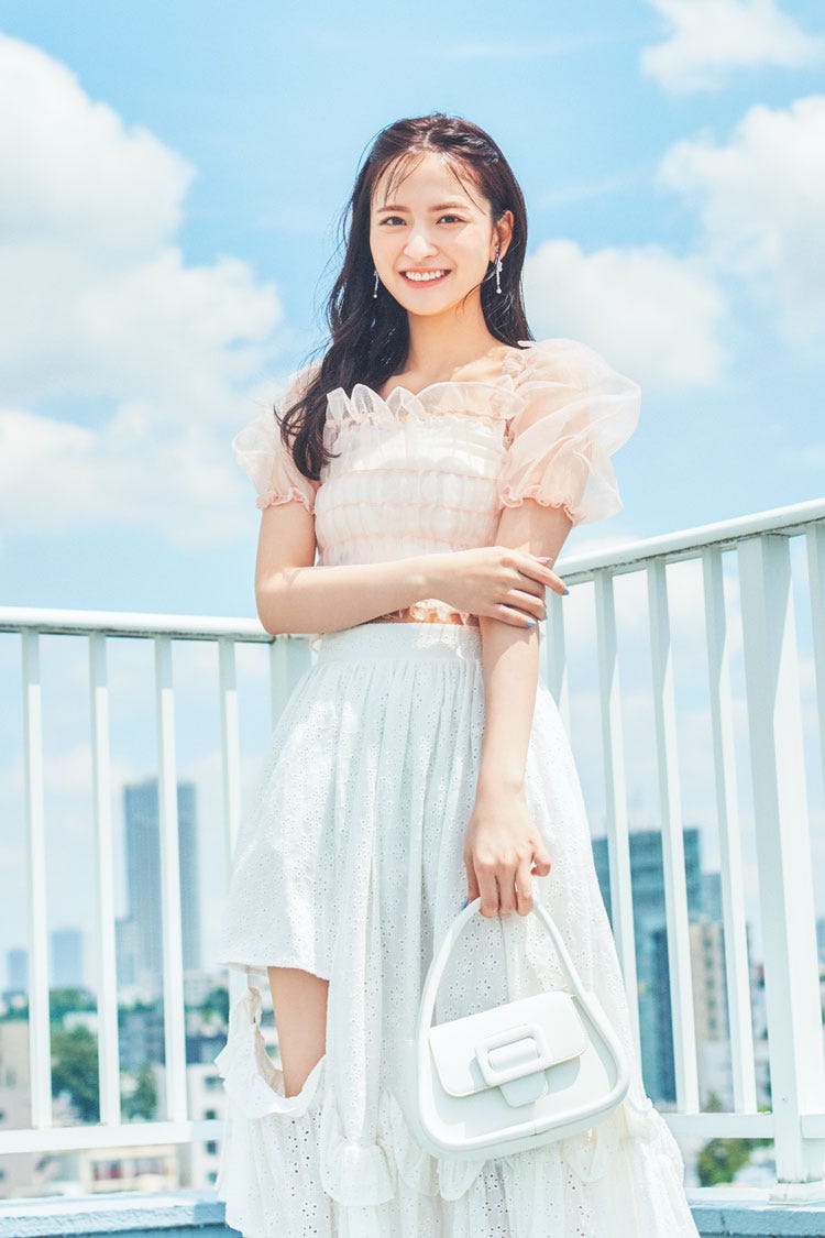 アシンメトリースカートは着回し。シアートップス 14,300円/The Girls Society イヤリング 3,630円/Phoebe 白バッグ 7,480円/レイ ビームス(レイ ビームス 新宿) 撮影/女鹿成二(モデル)、上田祐輝(静物) スタイリング/稲葉有理奈(KIND) ヘア&メイク/サイオチアキ(Lila) モデル/金川紗耶(本誌専属) 文/柿沼奈々子