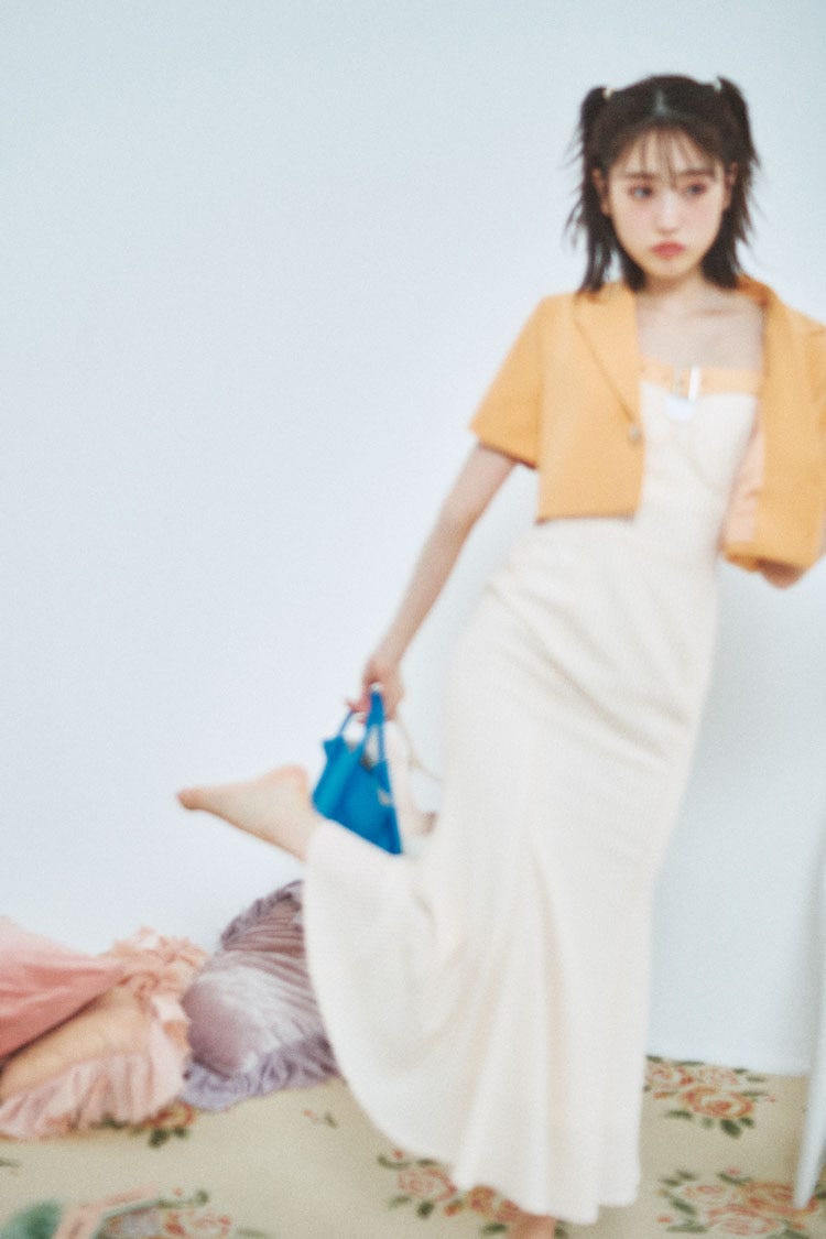 ショートジャケットと胸元のデザインが可愛いマーメイドワンピースの相性は抜群!差し色にブルーのバッグを取り入れたら夏っぽカラーコーデの完成♡