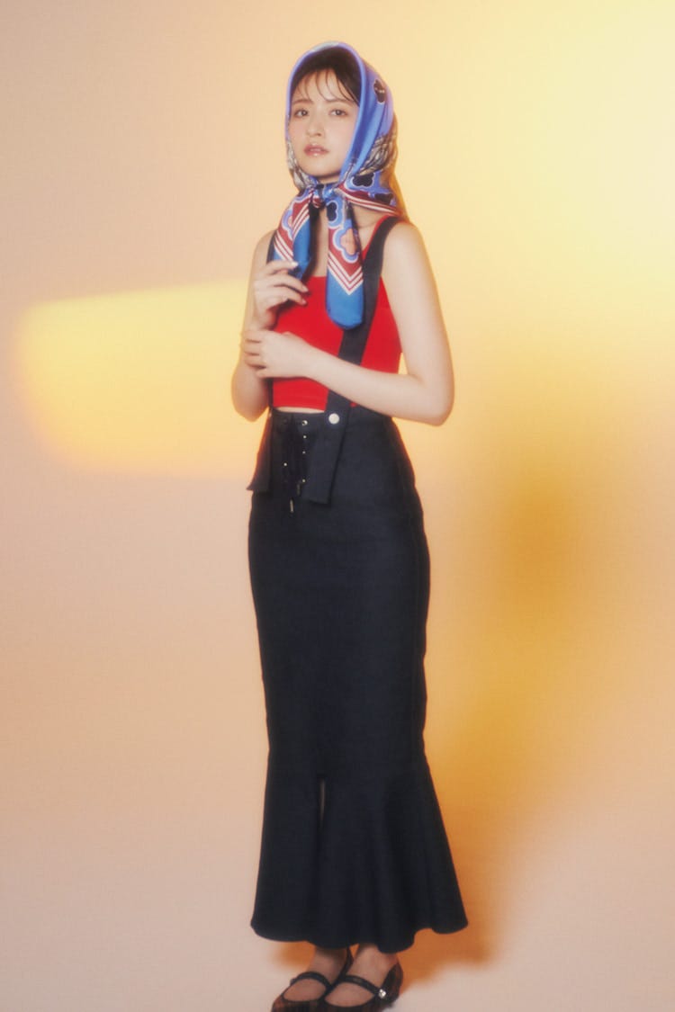 赤で印象的にフレンチガーリーマーメイドラインのデニムスカートでこっそりスタイルアップ。レトロ柄スカーフをくるりと巻いてシネマの世界にトリップ。