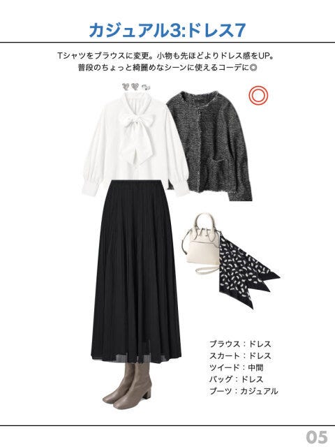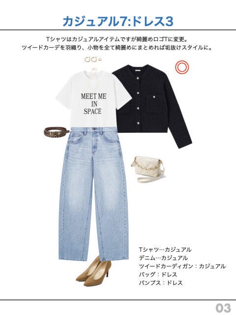なんだか垢抜けないな、という方は「ドレス」と「カジュアル」のバランス、ぜひ参考に試してみてくださいね!