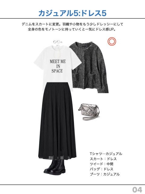 デニムをスカートに変更。羽織や小物をもう少しドレッシーにして全身の色をモノトーンに持っていくと一気にドレス感UP。