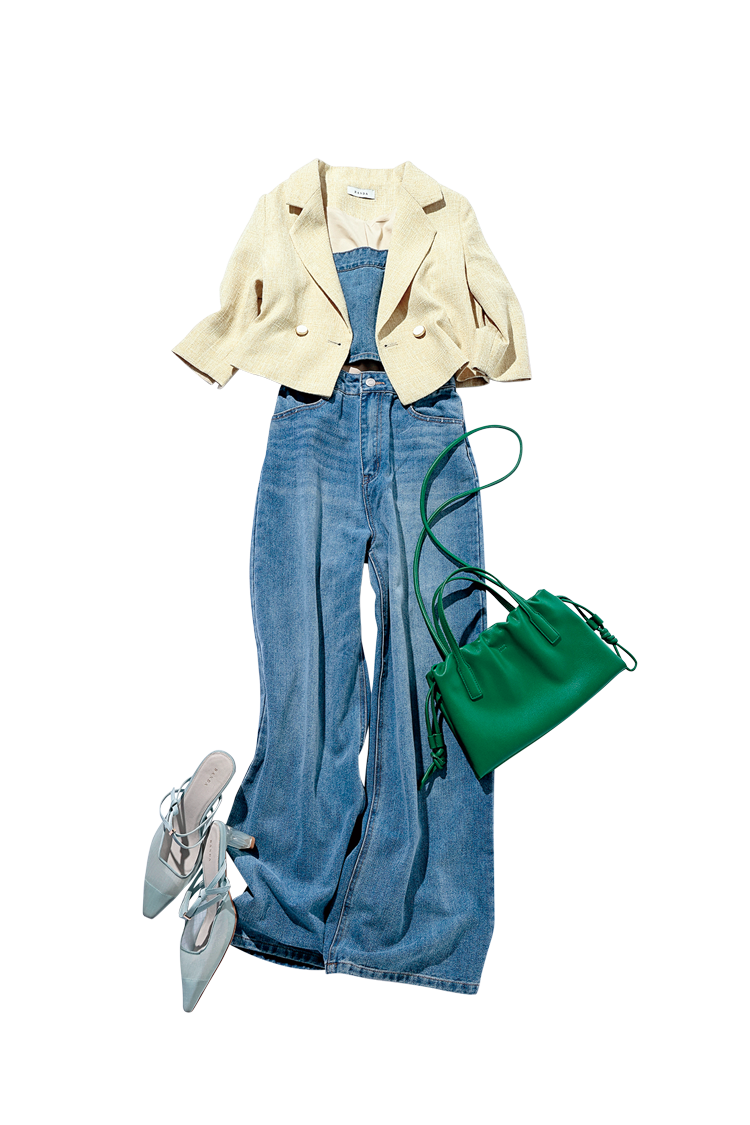 セットアップは着回し。ビスチエつきデニム 3,299円/GRL グリーンバッグ 9,900円/ル・ベルニ(キャセリーニ) グリーンリボンベルトパンプス 8,910円/RANDA Coordinate5 ミニ丈ワンピで大人デートコーデ