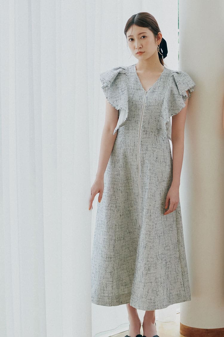 クラシックなムードを今どきデザインに昇華♡切りっぱなしフリルやジップに凜とした女性像が見え隠れ。品行方正でお出かけ服ぴったりなツイード。日差しに小さく輝く、ラメの演出がニクイ♡