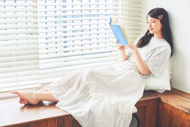 ロゴTシャツは着回し。イエローセットアップ(ワンピースのみ使用)各14,960円/RANDA ブルーバッグ 6,600円/コントロールフリーク(キャセリーニ) 白スニーカー 6,930円/MORE self LOVE 撮影/女鹿成二(モデル)、上田祐輝(静物) スタイリング/稲葉有理奈(KIND) ヘア&メイク/サイオチアキ(Lila) モデル/金川紗耶(本誌専属) 文/柿沼奈々子