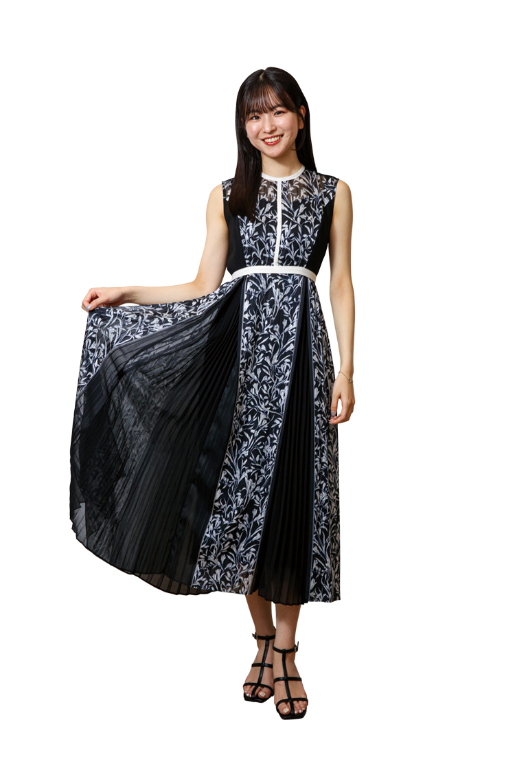劇団四季を見に行くので、スマートカジュアルな服装をチョイス!花柄の落ち着いたモノトーンのワンピースで上品な雰囲気を演出!実は背中があいていて、ほどよい露出で女性らしさをアピールしてみました♡