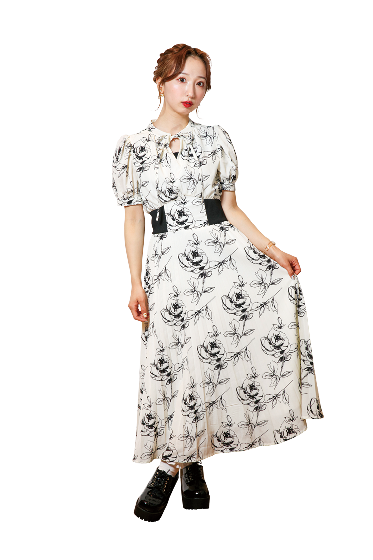 女子会にぴったりな、華やかな色あいのワンピースを選びました!シフォン生地のワンピースなのでガーリーな雰囲気を醸し出せます!高い位置でのウエストマークと厚底をはくことで、脚長効果を狙っています♡