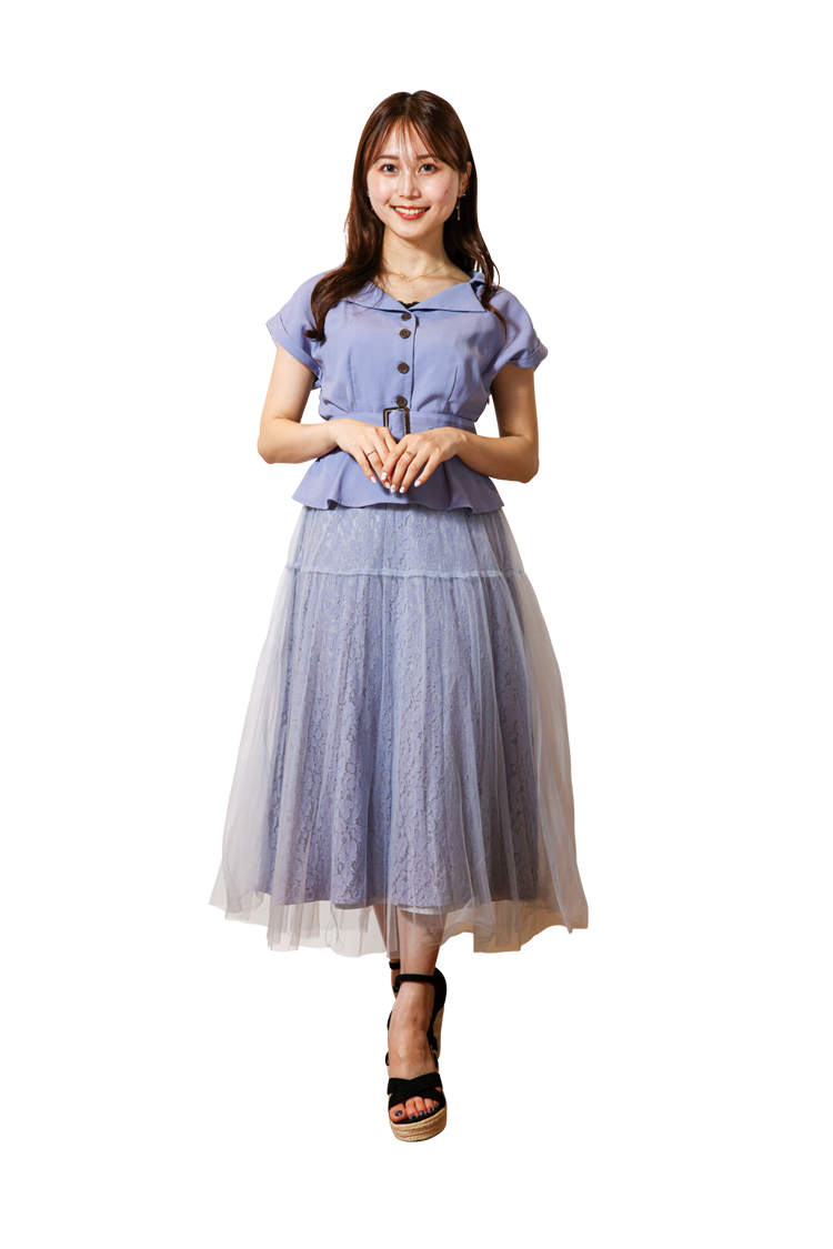 銀座に行くので、えりつきシャツのトップスでスマートカジュアルな雰囲気を演出!レースとチュールを組みあわせたスカートで華やかな雰囲気に!ウエストを高くマークできるので、スタイルよく見えます♡