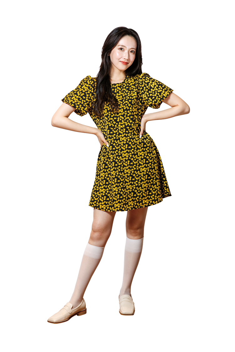 ひまわり畑に映える黄色のお花柄のミニワンピをチョイス!パフスリーブで二の腕は細見えを、ウエスト引き締めのミニデザインで脚長&スタイルアップを狙っています♡ トレンドの白ソックスもポイントです!