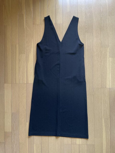少しストレッチのきいた素材で着心地が良いこのワンピース。深めのVネックでインナー次第で様々な着こなしが楽しめます。
