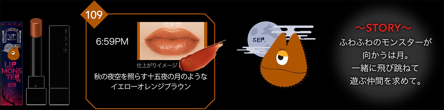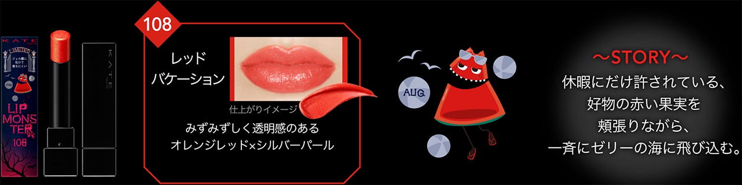 “MYリップモンスター”は、シーズンごとに各月をテーマとするモンスターが3体ずつ登場する限定コレクション。シーズンは全4回を予定し、合計12体のモンスターが登場。今回発売するseason3は7月~9月をテーマとし、7月「107 紅折り紙の願い」、8月「108 レッドバケーション」、9月「109 6:59PM」をラインナップ。