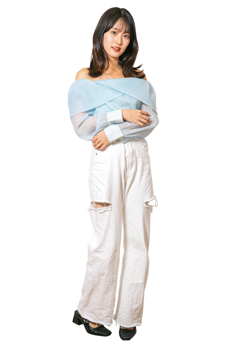 デニムにもスカートにもあうラフなTシャツ「KブランドのMardi MercrediのロゴTはとにかくあわせやすく重宝しています。流行のY2Kファッションやこだわりのある色・柄の服が韓国ブランドには多いので、服を買うときは必ずチェックしています!」