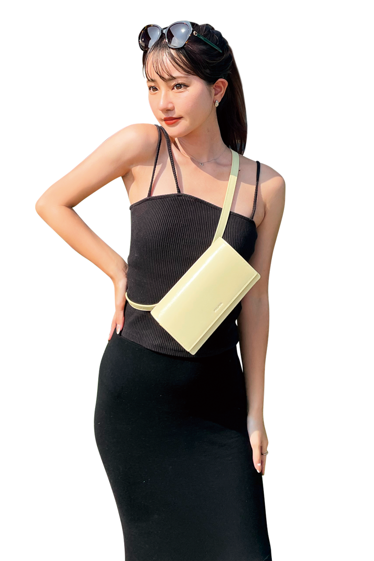 Kブランドのバッグで簡単にしゃれる「このバッグは韓国のデザイナーズブランドFolnuaのもの。モノトーンコーデの差し色に使いました。ショルダーバッグとウエストバッグの2Wayで使えるので便利♪」
