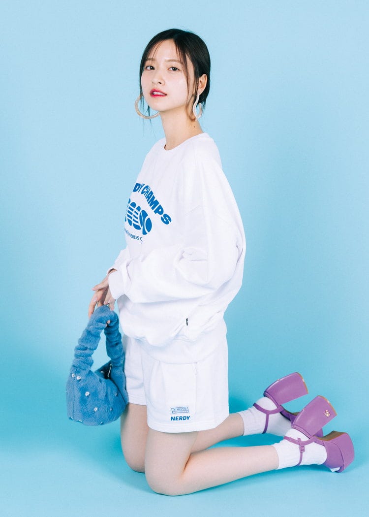 白ロゴスエットとショーパンのセットアップコーデ。レトロ感のあるアイテムはガーリーな小物と相性抜群!パープルのサンダルをコーデの差し色に。顔まわりに存在感のあるアクセサリーを取り入れると小顔効果も◎。