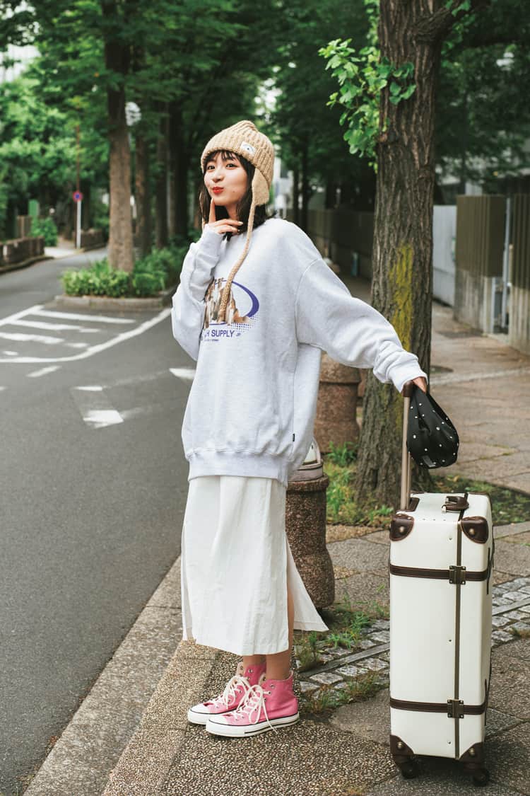 犬プリントスエット 13,200円/POLY(POLY SHOP) 白ワンピース 22,958円/DIAGONAL(MUSINSA GLOBAL STORE) ニット帽 3,630円、スニーカー 7,150円/ともにコンバース バッグ 7,990円/MANGO(LOCONDO) 撮影/田形千紘 スタイリング/杉本奈穂(KIND) ヘア&メイク/後藤若菜(ROI) モデル/岡崎紗絵(本誌専属) 文/柿沼奈々子