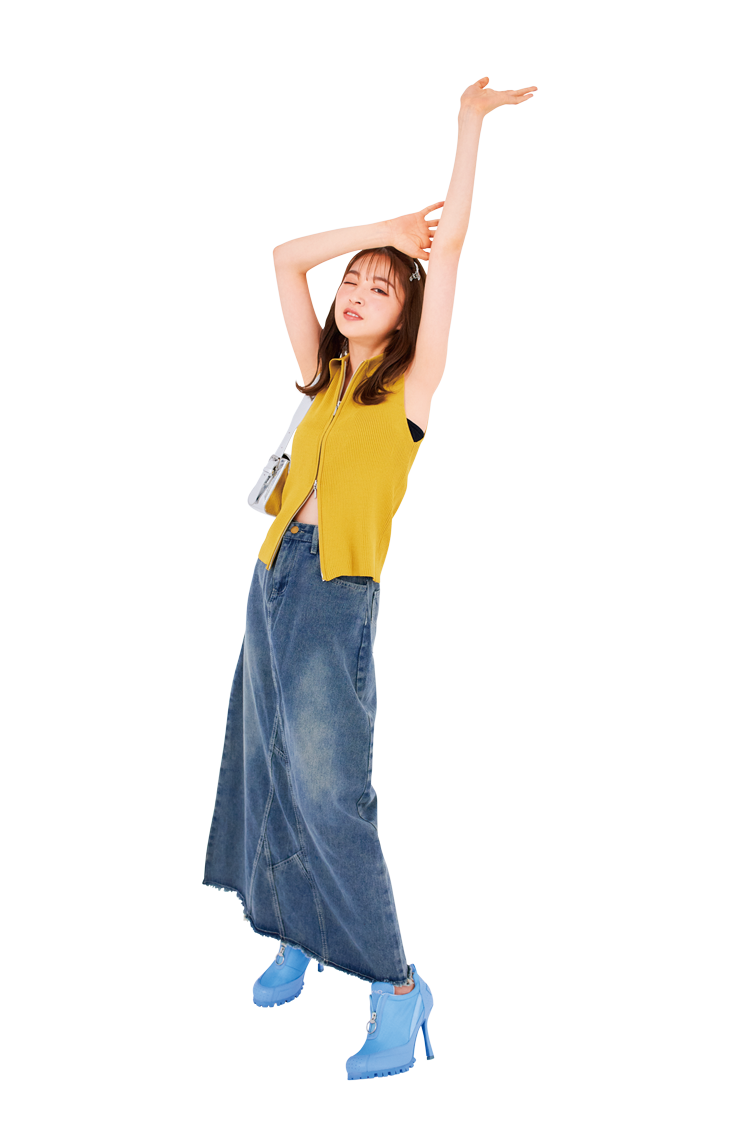 イエロージップアップノースリトップス 7,590円/LILLIAN CARAT(リリアン カラット) デニムスカート 4,399円、シルバーバッグ 3,299円/ともにWEGO ヘアピン(2本セット) 1,650円/Treat ürself ブルースニーカーヒール 23,100円/YELLO インナー/スタイリスト私物 Check!4 デニムジャケット