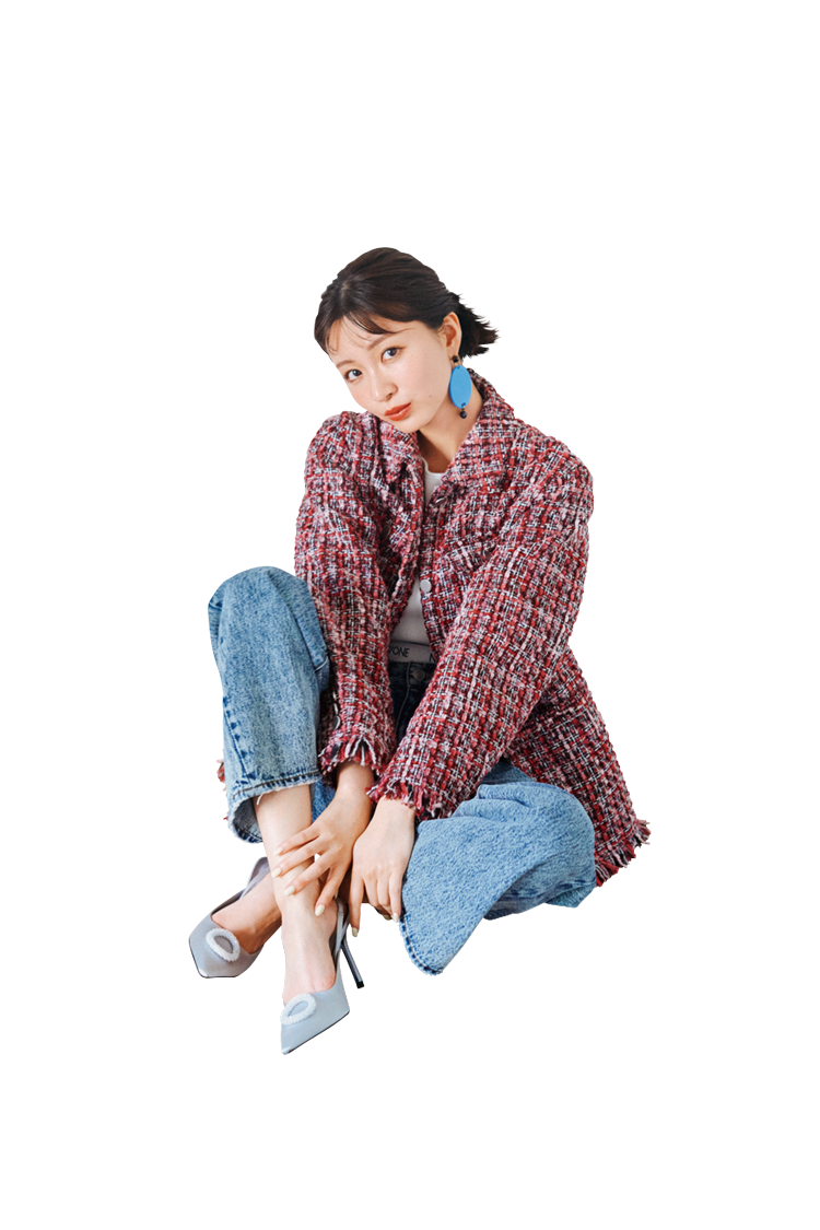 無難なストレートデニムもツイードジャケットを羽織ればすぐ韓国風に。デニムとヒールの組みあわせはしゃれ見え確実!