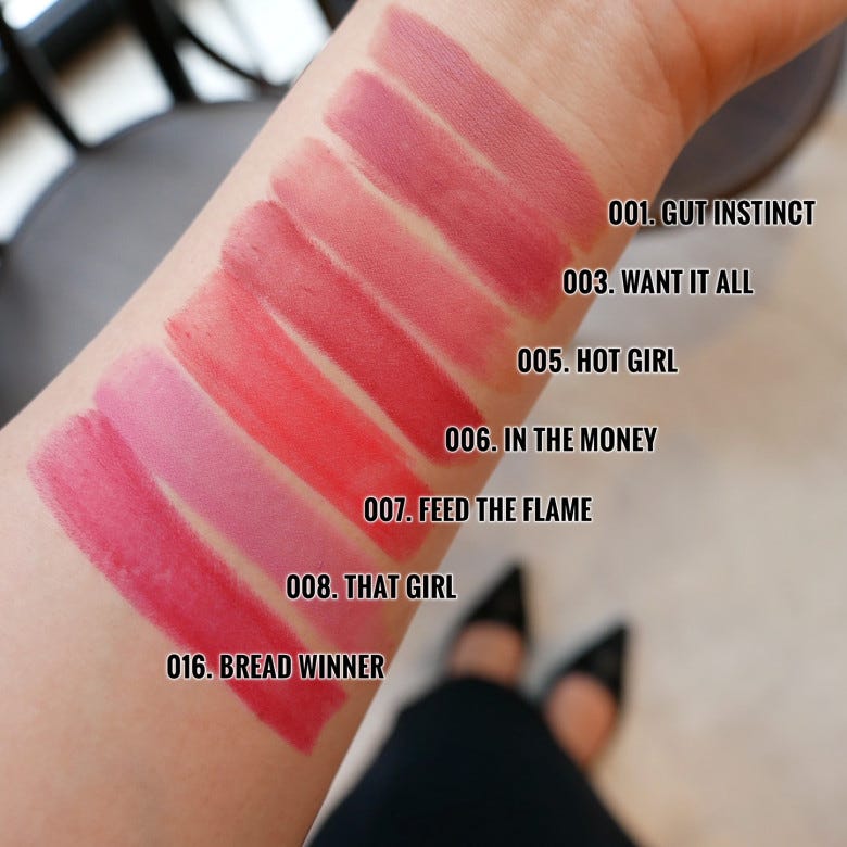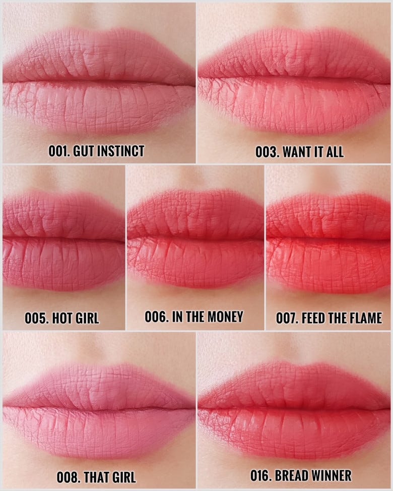 また、この3つの着画↑はしっかりと唇に塗った後にティッシュオフした仕上がりですが、同じリップでもひと工夫加えるだけでガラりとイメージが変わるのでおすすめ。