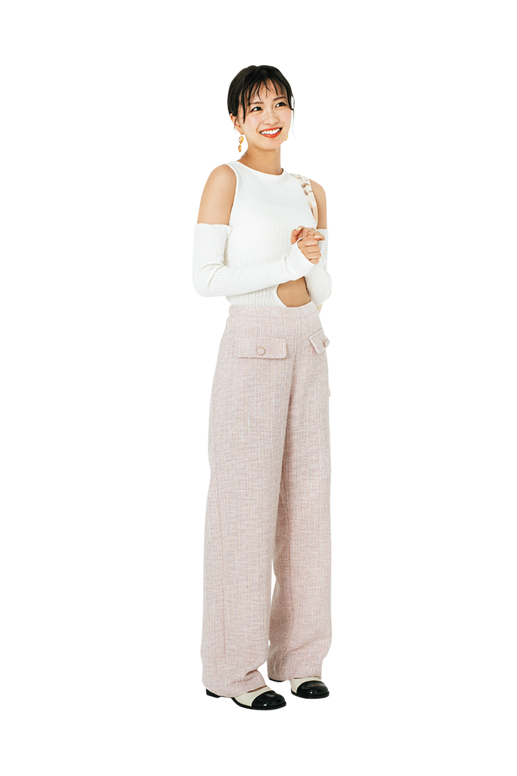 程よくフィットするトップスで、上半身をすっきり見せ。パステルピンクのツイードパンツで女のコらしさも意識して♡