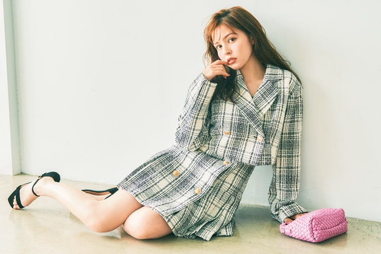 ガーリーに仕上がるツイードが主役のコーデ。失敗しない王道のモノトーン配色が◎。セットでコーデ全体の統一感が上がるよ。コーデの差し色にピンクバッグをチョイスして♡