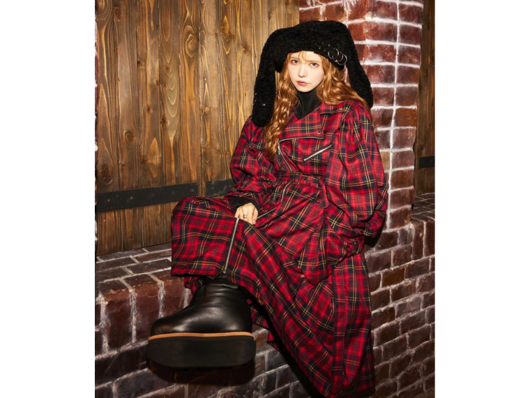 チェック柄のドレスは、アウターとしても着られるサイズ感。MA-1は袖にボリュームを持たせ、「男性が着てもダボダボして見えるように、立体的に作った」など、益若さんらしいこだわりを詰め込んだ。