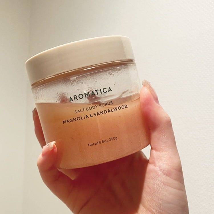 AROMATICA:ソルトボディスクラブ マグノリア&サンダルウッド洗い上がりの肌がすごくモチモチするうえに、不要な角質ケアもしてくれるので使用後のサッパリ感がたまりません。香りも好き♡