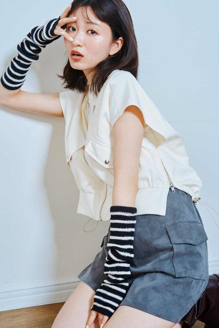 ボーダーアームカバー 1,099円/WEGO アイボリースリーブレスMA1 11,000円/rienda(バロックジャパンリミテッド) 黒ミニスカート 3,849円/Figments ブラウンブーツ 14,900円/チャールズ&キース(チャールズ&キース ジャパン) インナー/スタイリスト私物 Item5 白花柄ミニスカート