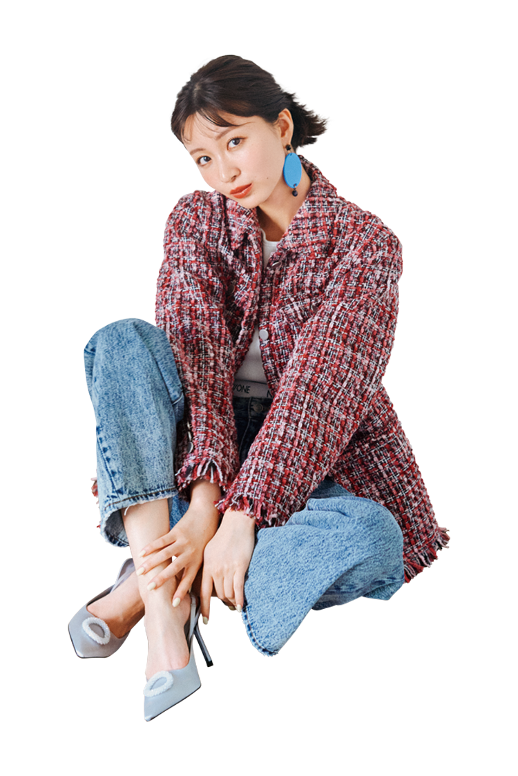 Item1 デニムパンツ ストレートデニムで脚をスッキリ魅せる◎。デニムとヒールの組みあわせは、しゃれ見え確実! ピンクフリンジツイードジャケット 23,980円/LILY BROWN 白タンクトップ 2,750円/スピンズ デニムパンツ 4,399円/WEGO ピアス 9,900円/アビステ シルバーバックストラップパンプス 9,500円/チャールズ&キース(チャールズ&キース ジャパン) Item2 グレーミニスカ