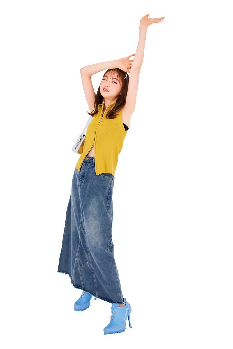 イエロージップアップノースリトップス 7,590円/LILLIAN CARAT(リリアン カラット) デニムスカート 4,399円、シルバーバッグ 3,299円/ともにWEGO ヘアピン(2本セット) 1,650円/Treat ürself ブルースニーカーヒール 23,100円/YELLO インナー/スタイリスト私物 Item4 黒ミニスカート
