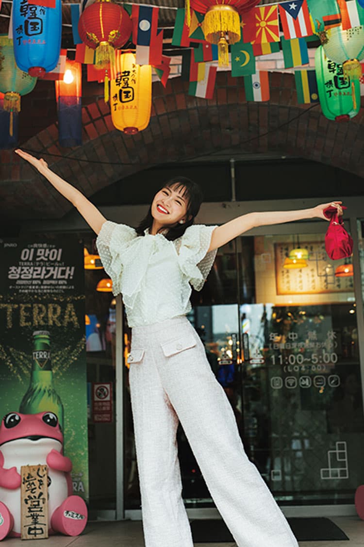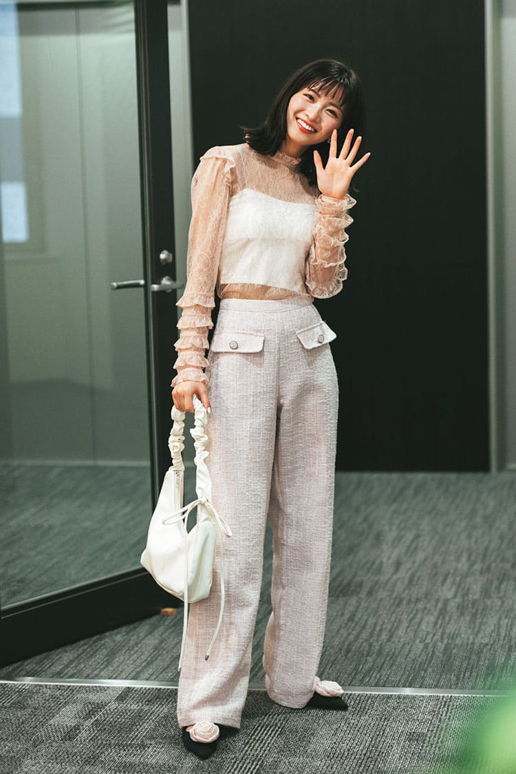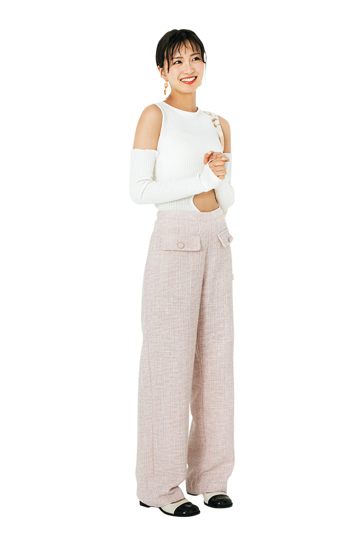 Item 着回すアイテムはこちら! ツイードパンツ ルセラのステージ衣装みたいなカラーツイードのパンツ。甘~いディテールにきゅん♡ 前についたポケットがアクセントに。 ツイードパンツ 10,900円/MANGO(LOCONDO) Coordinate1 上機嫌な日のピンクコーデ おそでのフリルで糖度マシマシ。やっぱりピンク×ピンクの組みあわせは可愛くて気分が上がる♡ ツイードパンツは着回し。