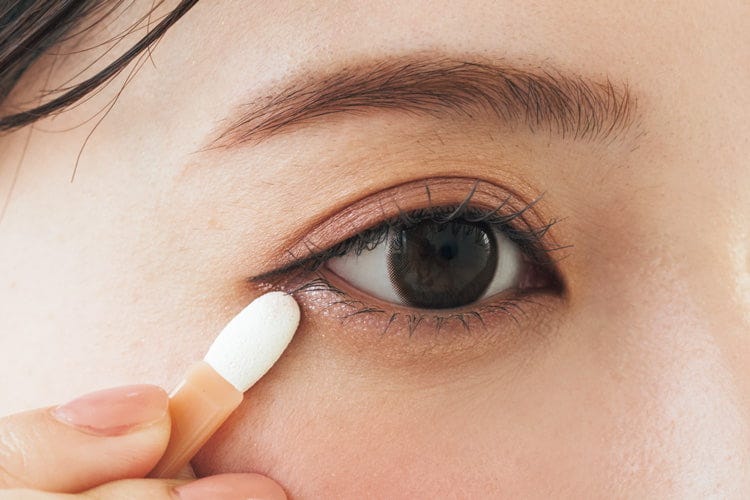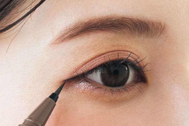 Bで上まぶたの目尻にだけアイラインを引く。目の形に沿わせながら、少し延長させる。A右下を目頭から約1cmだけ下まぶたのきわにオン。さらに目尻ラインの上に重ねる。
