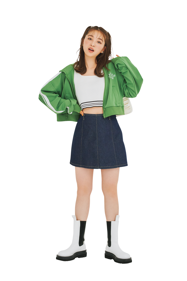 グリーンパーカ 5,059円、デニムミニスカート 3,849円/ともにW♥C リブニットタンクトップ 4,950円/LILIAN CARAT(リリアン カラット) イヤリング 7,140円/アビステ 白バッグ 3,299円/WEGO 白サイドゴアブーツ 8,800円/Figment 撮影/藤原宏(Pygmy Company・岡崎、中村分)、峠雄三(金川分)、女鹿成二(上西分) スタイリング/稲葉有理奈(KIND・岡崎、中村・上西分)、城田望(KIND・金川分) ヘア&メイク/室橋佑紀(ROI・岡崎、 中村・金川分)、サイオチアキ(Lila・上西分) モデル/岡崎紗絵、金川紗耶(本誌専属)、中村里帆、上西星来