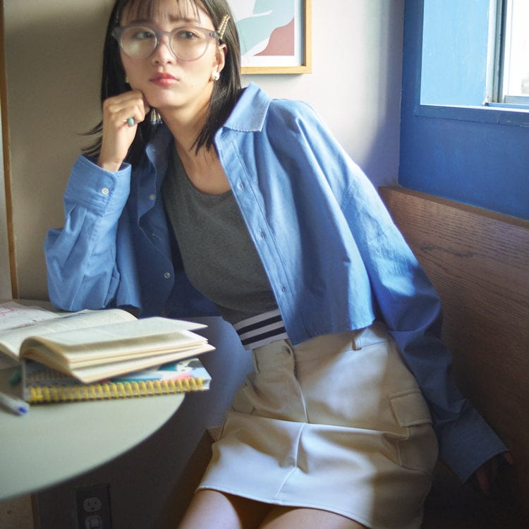 シャツ×ミニスカの定番コーデ。ミニ丈のシャツでスタイルアップ効果を狙って!タンクトップのラインデザインがコーデのアクセントに。ヘアアクセやイヤリング、メガネなどの小物で顔まわりを華やかに仕上げました。