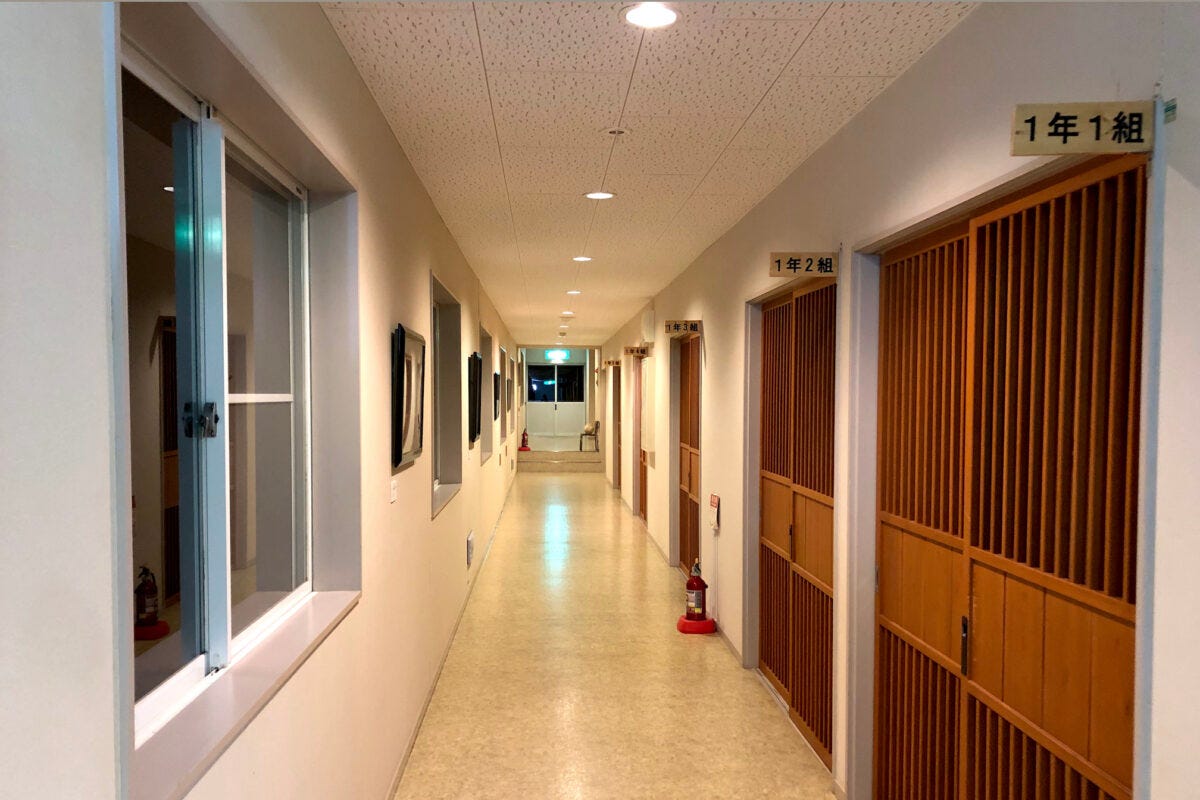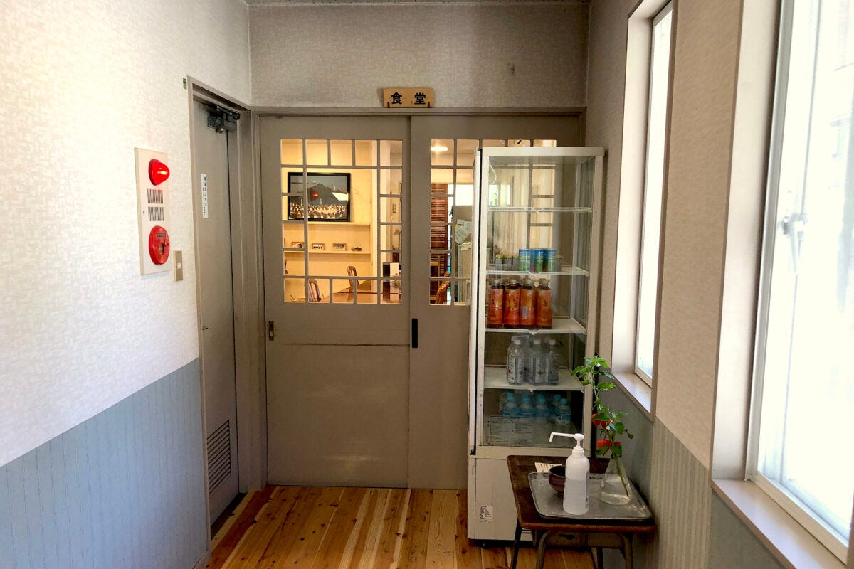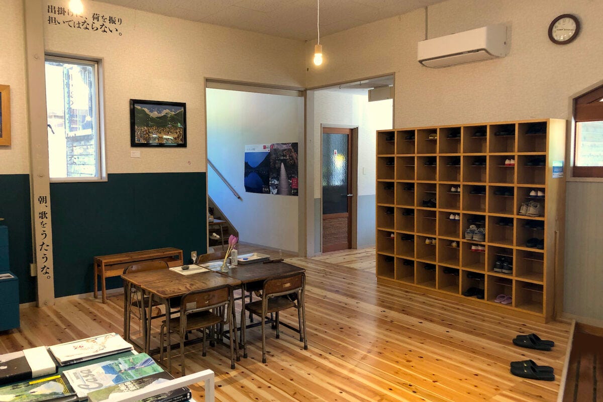 学校だった頃の面影があちらこちらに残る宿。1階ロビーには机や靴箱などがあり懐かしい気持ちになります。