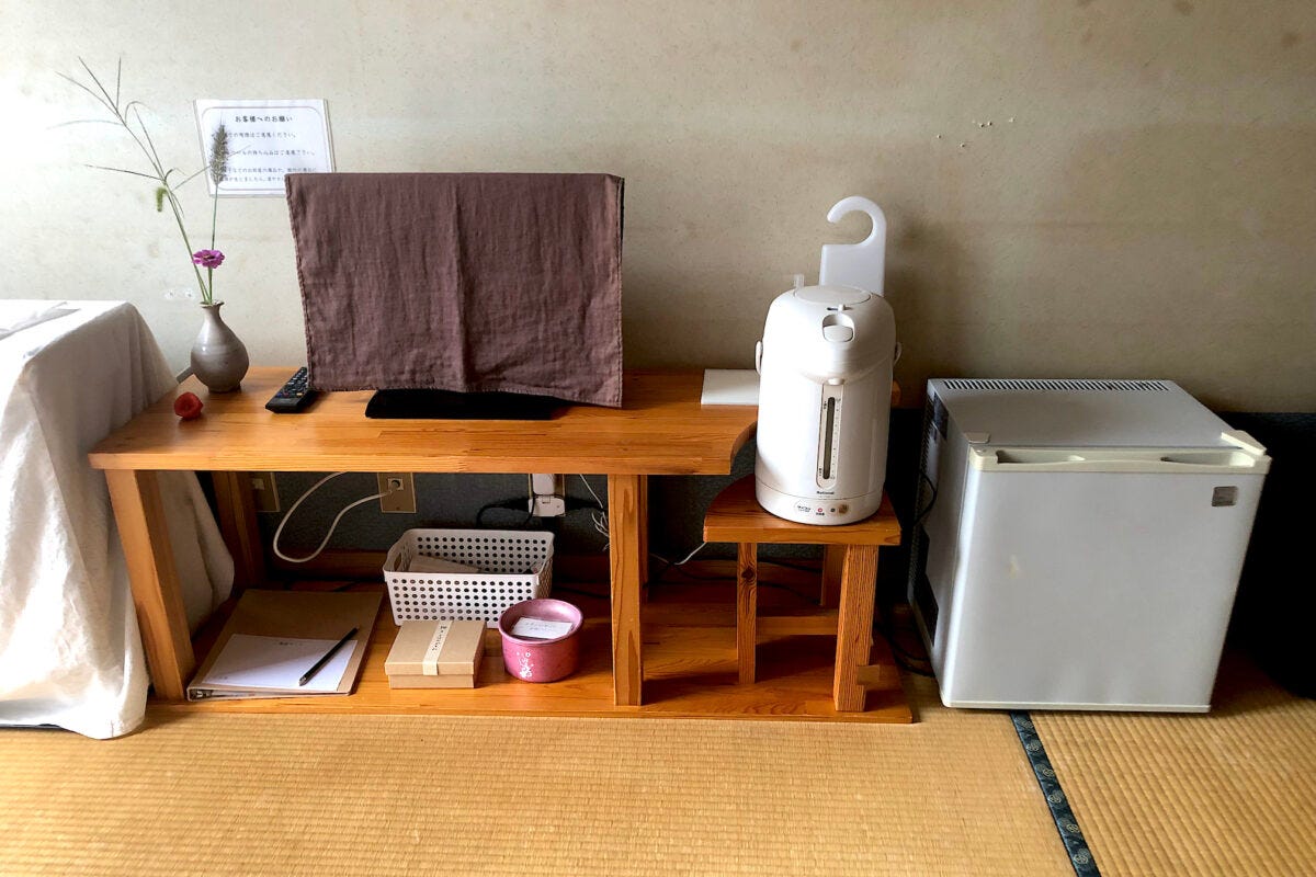 客室には湯沸かしポットや持ち込み用冷蔵庫、テレビ、テレビ、エアコン、暖房器具、懐中電灯、卓上鏡、お茶セット、羽毛布団、ドライヤー、タオル、浴衣、丹前などが完備。無料Wi-Fiもあり、サクサク繋がります。