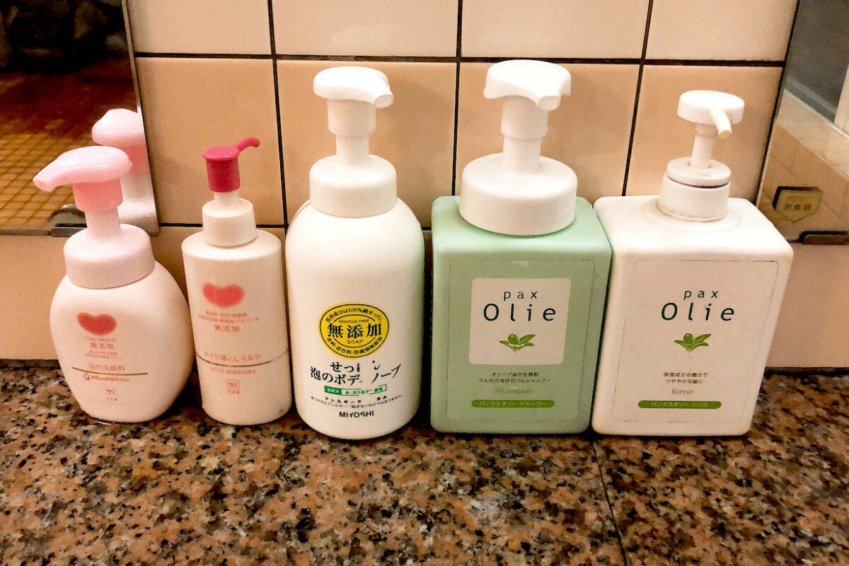 お風呂に備え付けのシャンプー類は、無添加のボディソープやpaxのシャンプー&リンス、カウブランドのメイク落としと洗顔料。オリーブ由来の『pax Olie(パックスオリー)』は 100%自然由来成分にこだわった石けんシャンプー。お肌にも環境にも優しいアイテムが揃っています。