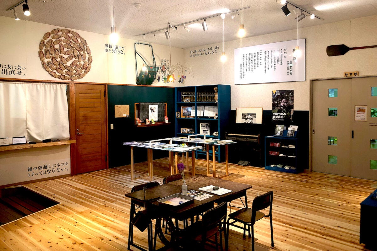 壁には、大地の芸術祭で原倫太郎さんが手がけた「マタギ文化」展示の名残があり、この地域に残るマタギに言い伝えられる言葉が描かれています。