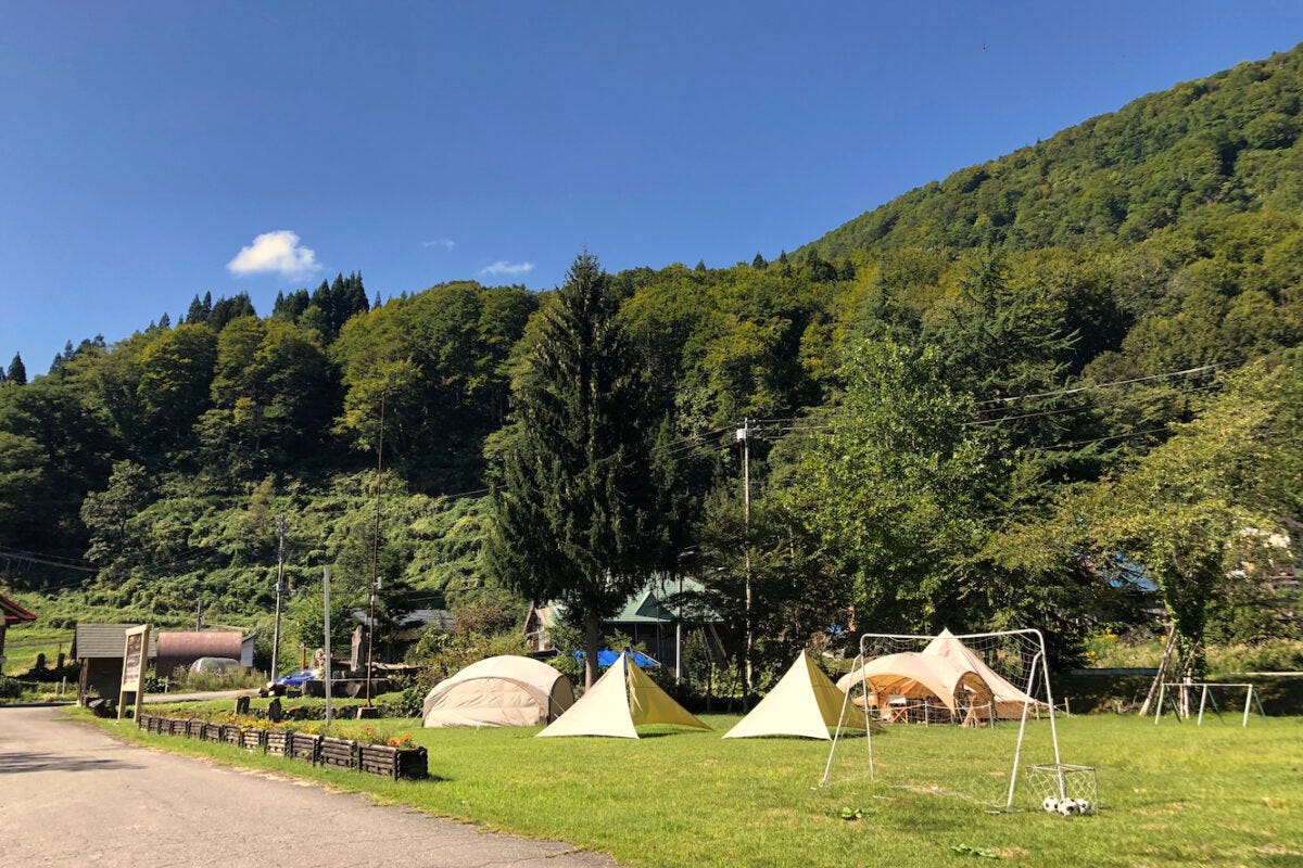 かたくりの宿のグラウンドでは、自分でテントを張って泊まったり、設置してあるグランピングでの宿泊も可能です。1人1500円で、温泉・食事は別料金。宿内のトイレやWi-Fiは無料で利用できます。