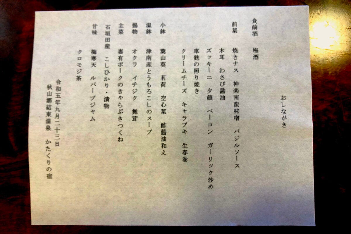 縄文時代から人々が住み続けている津南町では、山菜やきのこ、美味しい米や野菜が育つそう。写真は私が訪れた際の夕食のお品書き。