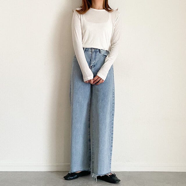 ふんわりボリュームのあるワンピースのインナーにピッタリなクルーネックTは、薄手なので、中に着込んでも着膨れせずにちょうどいいんです♡