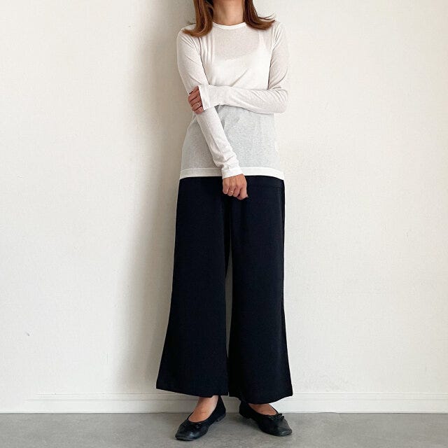 カジュアルな印象になりがちなクルーネックも、ほんのりシアーのおかげで、女性らしいスタイリングへと導いてくれます。