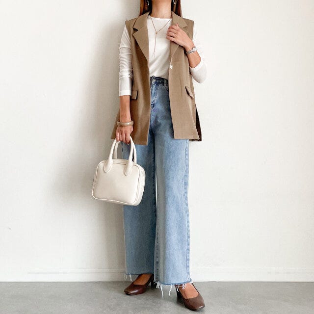 先程のNGコーデで取り上げたデニムコーデも、ジレを羽織るだけで、一気にこなれ感がプラスされます!