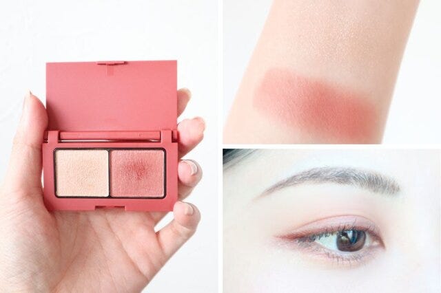 じんわりとした秋っぽい血色感の演出にぴったりな2色アイシャドウ。赤茶カラーで赤メイクでも腫れぼったさが出にくく、肌なじみがいいので溶け込み方も自然。
