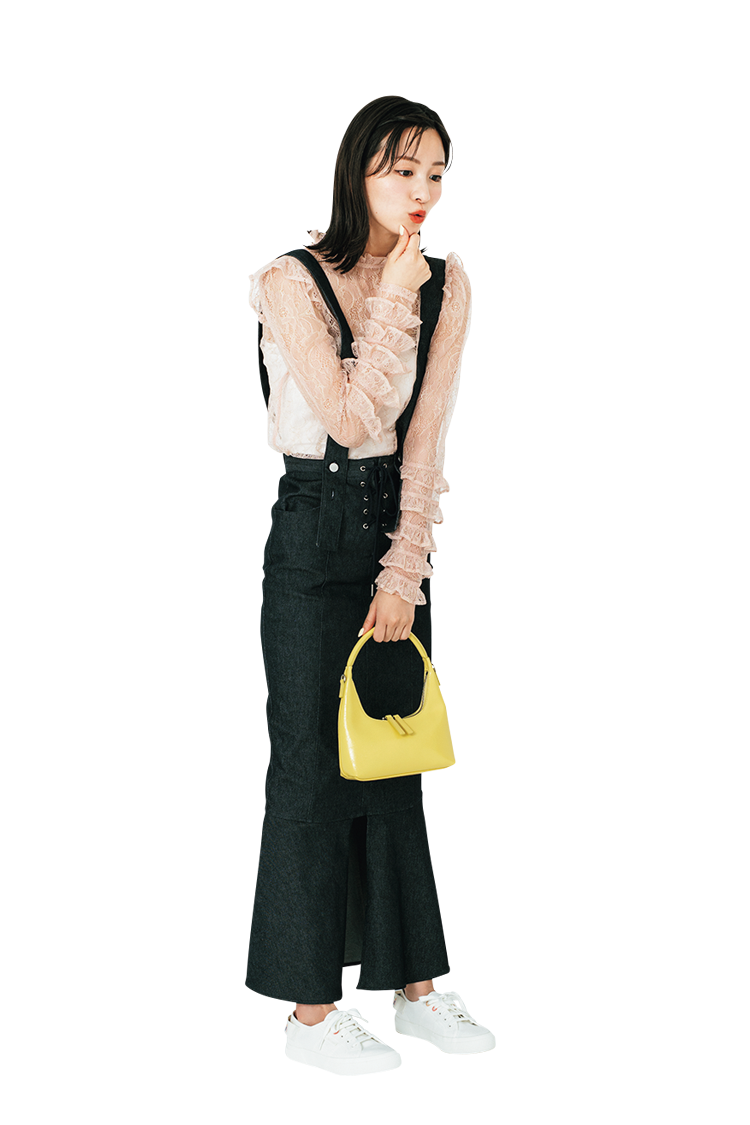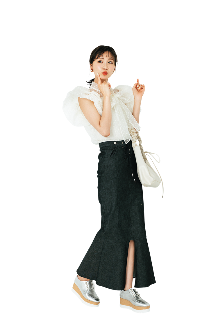Item 着回すアイテムはこちら! デニムロングスカート マーメイドLINEでデニムもフェミニンに。韓国で大流行のデニムは、あえてロンスカで自分流にセレクト!肩ひもをとりはずせる2Wayのスカートだから味変も◎。 デニムロングスカート 26,400円/HONEY MI HONEY Coordinate1 カジュアルガーリーコーデ ガーリーなブラウスにカジュアルなスニーカーあわせが可愛い♡ 透けブラウス