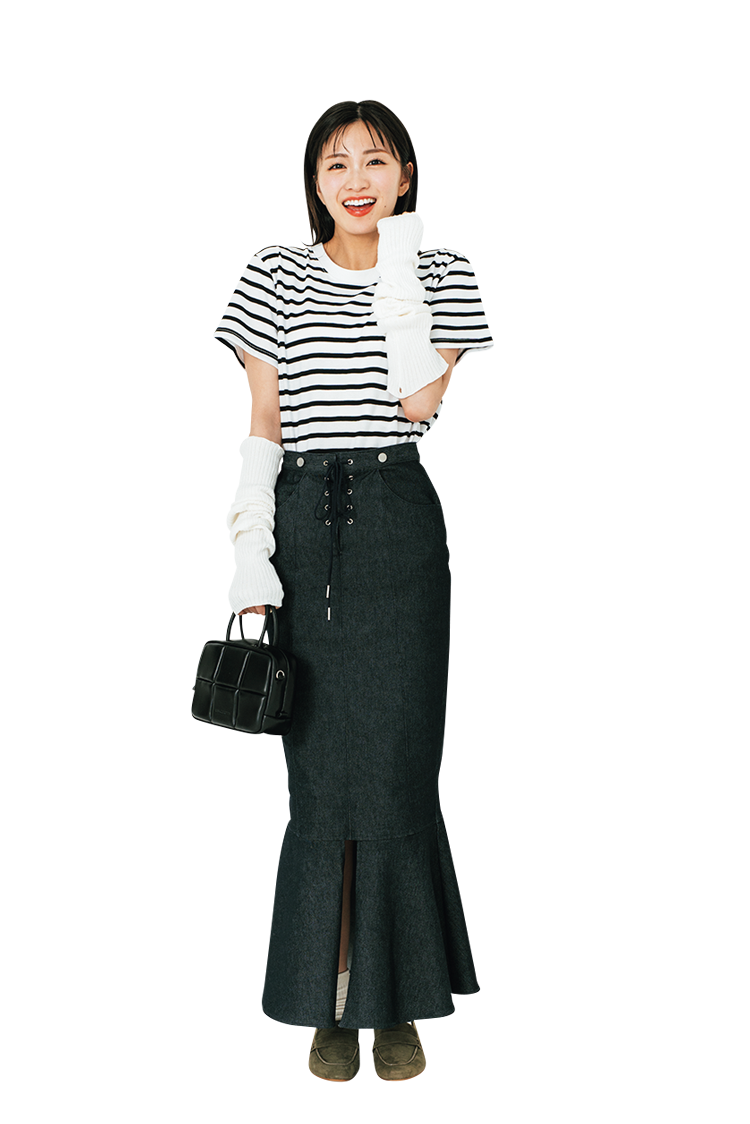 デニムロングスカートは着回し。ボーダーTシャツ 4,980円/épine 2Wayトップス(アームウォーマーのみ使用) 15,400円/The Girls Society バッグ 18,700円/ADDCULMN(ROSE BUD ルミネエスト新宿店) 靴下 550円/靴下屋(Tabio) ローファー 16,500円/ダイアナ(ダイアナ 銀座本店) Coordinate4 韓国っぽシンプルコーデ