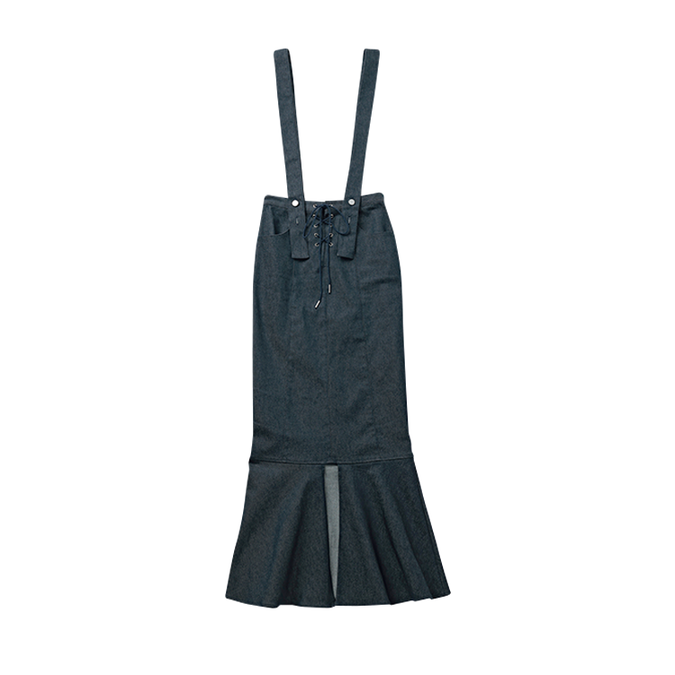 マーメイドLINEでデニムもフェミニンに。韓国で大流行のデニムは、あえてロンスカで自分流にセレクト!肩ひもをとりはずせる2Wayのスカートだから味変も◎。